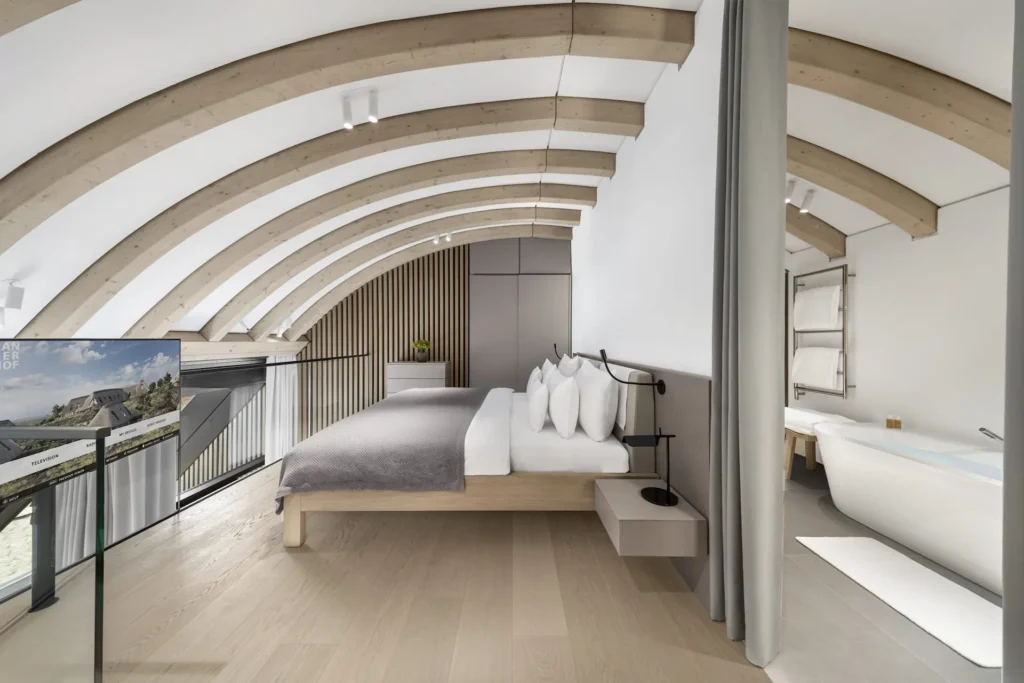 The spatial organization mirrors the Lanserhof worldview. Public areas—reception, lounges, restaurant—occupy the main level, offering social contact without overstimulation. Guest rooms above are restrained and deeply quiet, designed primarily for sleep quality and recovery. Below ground, the bathing world and fitness areas unfold with a clinical logic: saltwater pools, hydrotherapy zones, and movement spaces focused on circulation, musculoskeletal health, and regeneration.