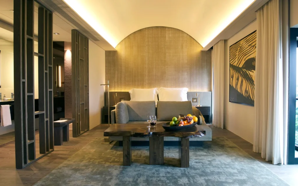 The rooms — scattered between the manor and newer, terraced buildings that step gently down the hillside — are studies in tactile calm. Floors are warm wood or stone, rugs are handwoven, and the color palette mirrors the valley itself: olive greens, river blues, sun-bleached neutrals. Large windows frame vineyards like living murals, and it is not uncommon to find yourself standing still, mid-unpacking, simply watching the light shift over the slopes. Technology is present but discreet; screens recede when not in use, and the emphasis is on physical comfort — the weight of the linens, the curve of the furniture, the quiet effectiveness of things that work without asking for attention.